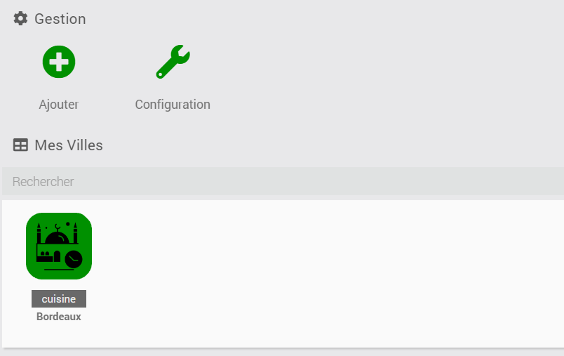 Pour fonctionner, vous aurez besoin de définir la ville pour laquelle vous souhaitez obtenir les heures de prières. Par défaut la ville configurée dans les paramètres de votre Jeedom est pré-définie.